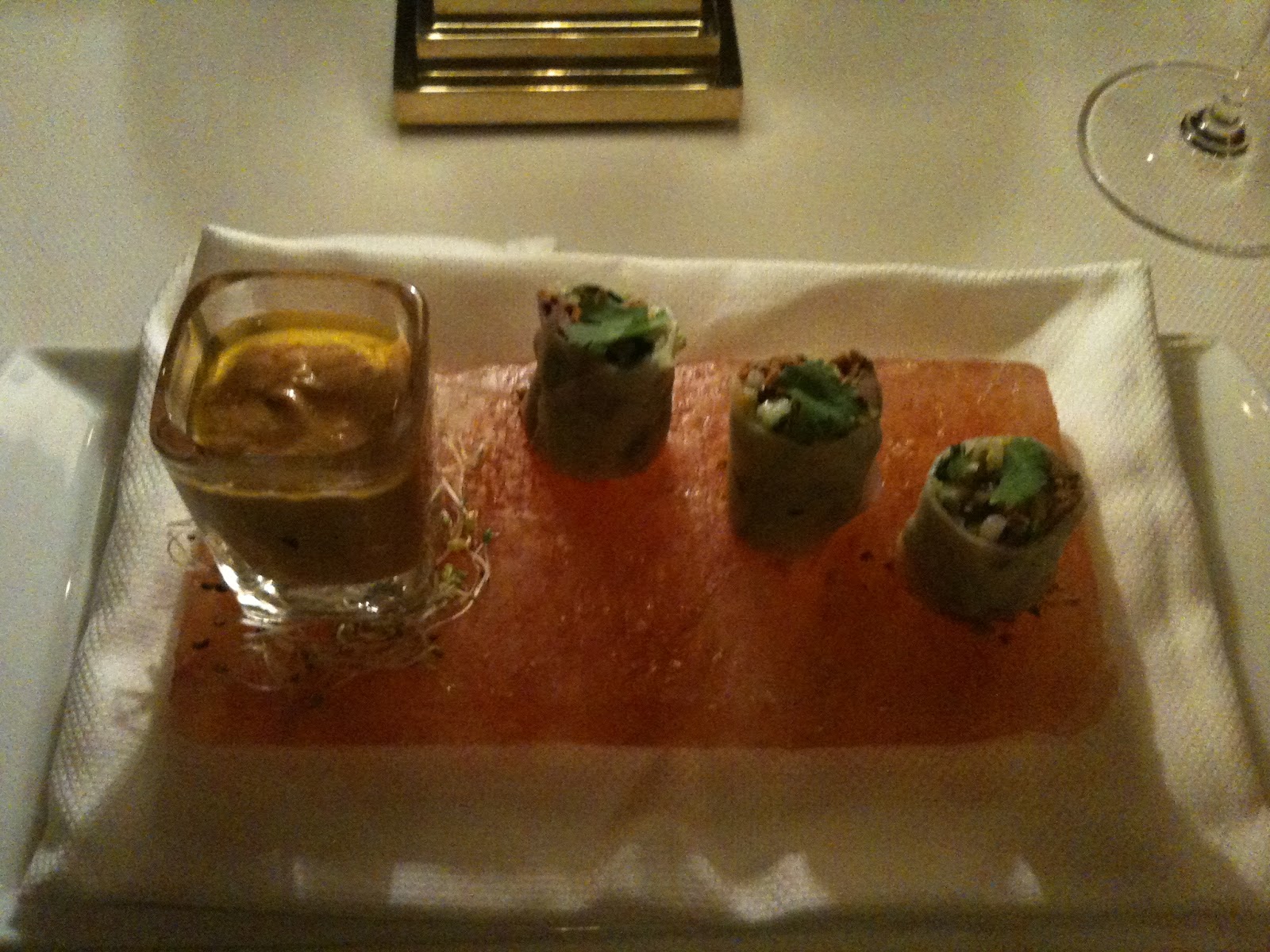 | Spring rolls with peanut curry satay on Himalayan salt block |